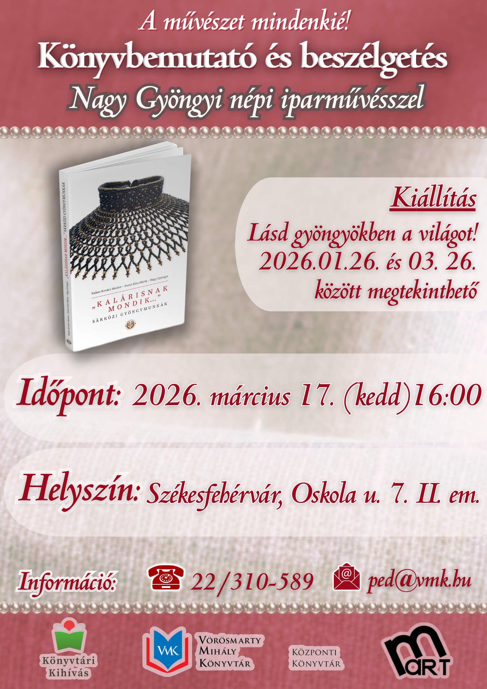 A művészet mindenkié kiállítás sorozat első állomása, "Lásd gyöngyökben a világot!" című kiállításhoz kapcsolódó könyvbemutató és beszélgetés Nagy Gyöngyi népi iparművésszel.