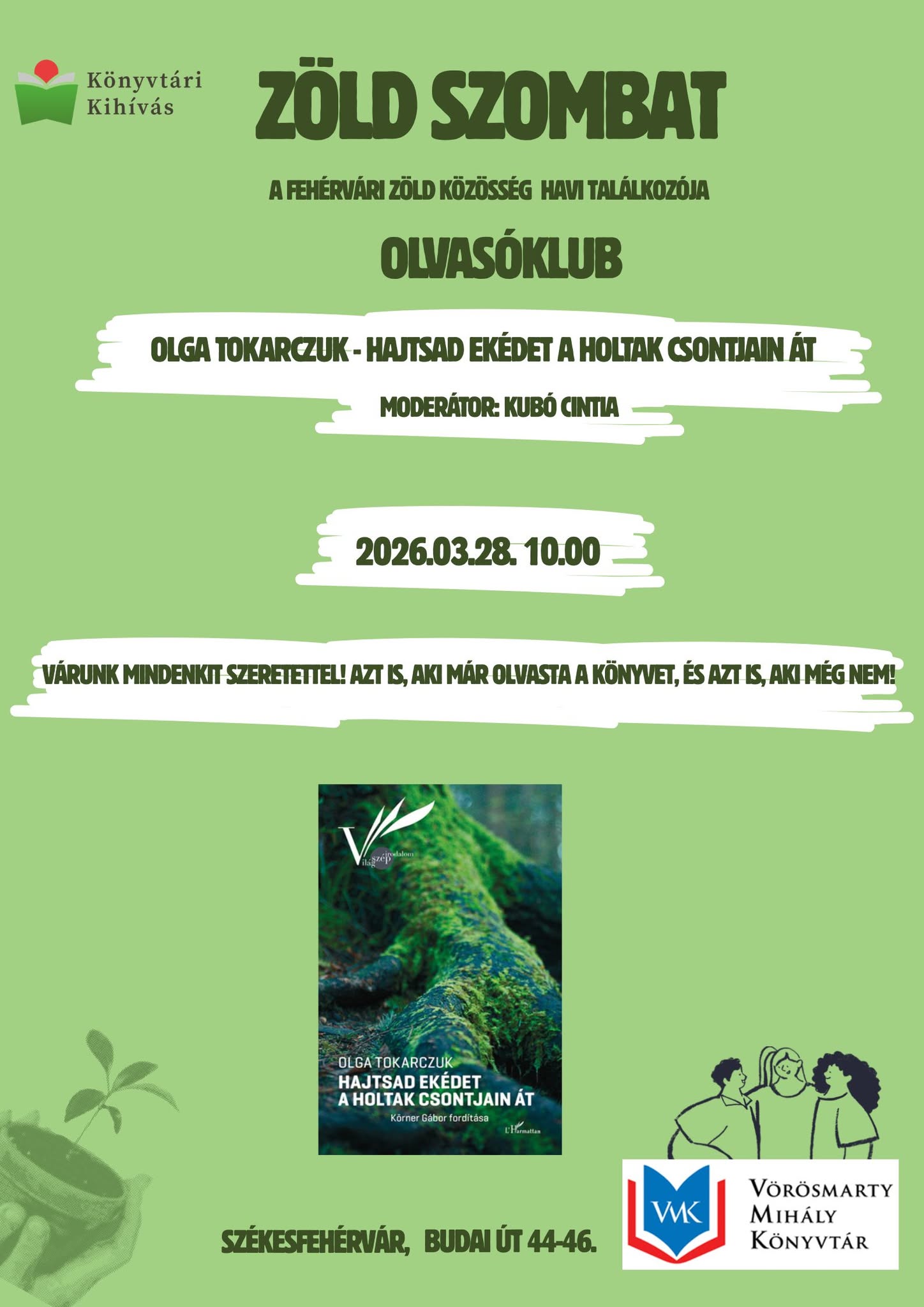 Fehérvári Zöld Közösség havi találkozója. A Zöld Szombat következő alkalmán Olga Tokarczuk Hajtsad ekédet a holtak csontjain át című regényéről beszélgetünk. A beszélgetést moderálja Kubó Cintia.