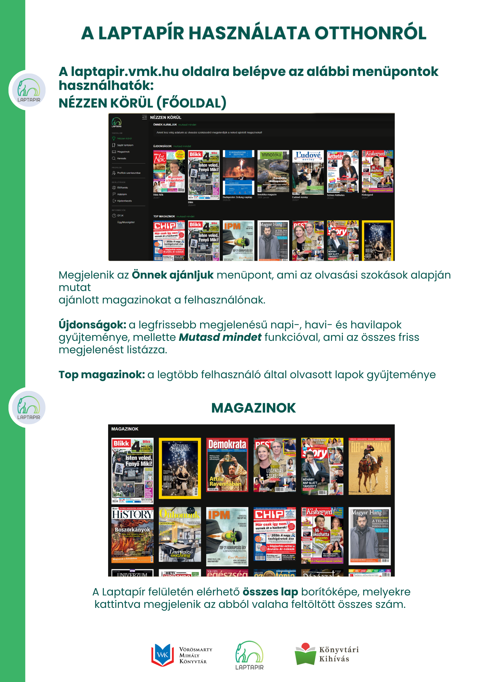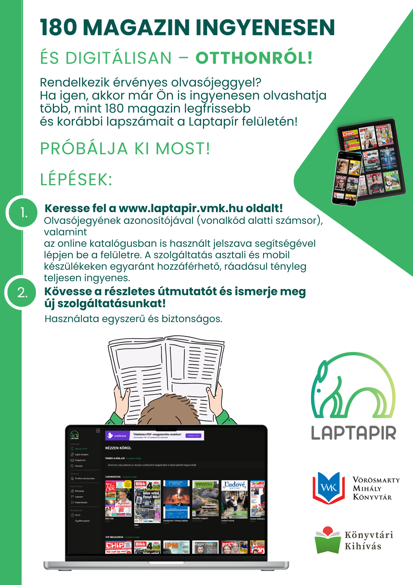 A Laptapír egy olyan digitális platform, amelyen több mint 180 folyóirat érhető el, könyvtári beiratkozás révén otthonról, ingyenesen. A folyóiratok között kulturális, művészeti, zenei, közéleti, természettudományos, ismeretterjesztő, vagy épp sport tematikájú lapok is elérhetők. A szolgáltatás igénybevételéhez nem kell mást tenni, mint beiratkozni a Vörösmarty Mihály Könyvtárba, és a laptapir.vmk.hu-n keresztül belépni a Laptapír felületére.