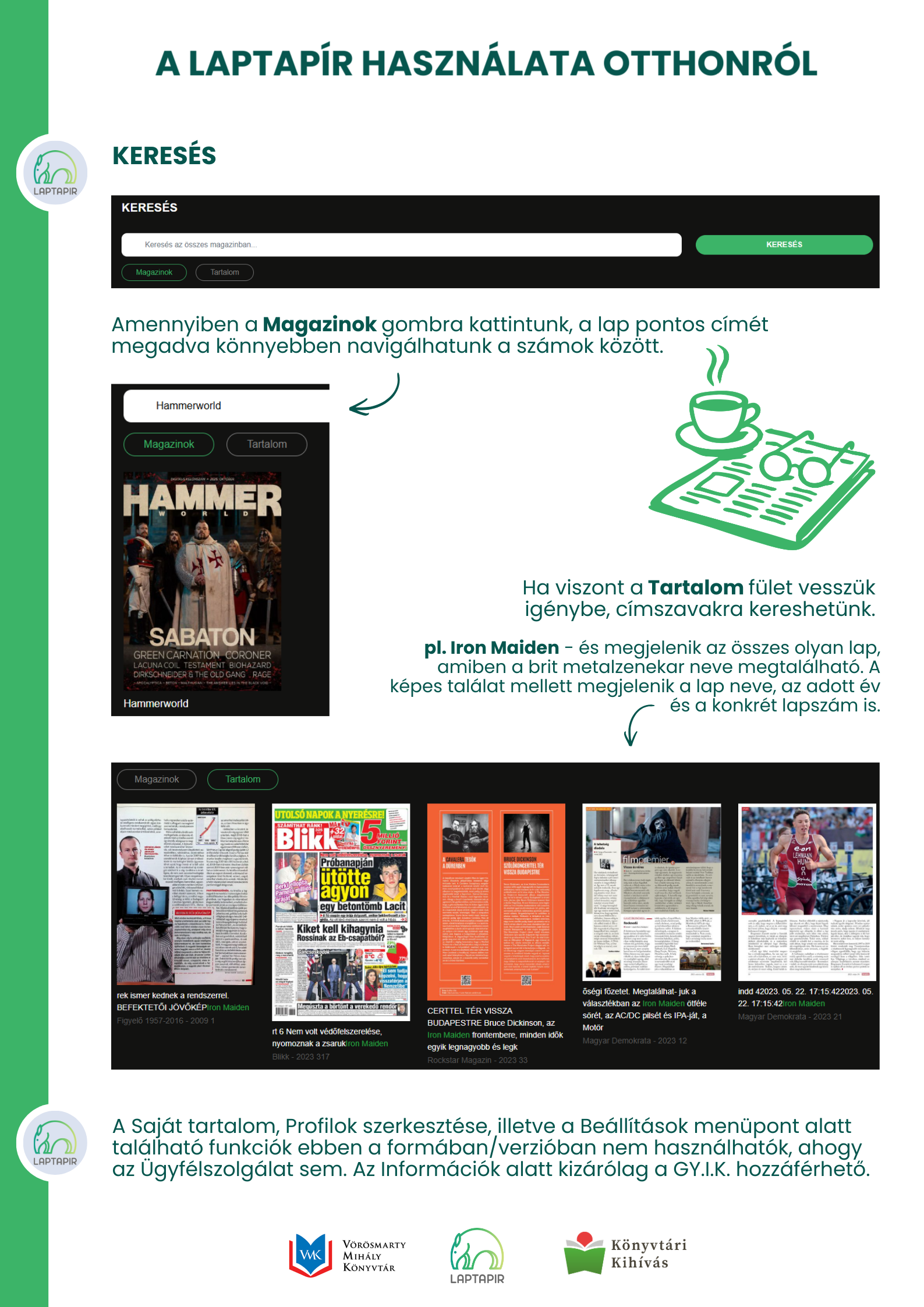 Keresés: egy keresősávot kapunk, mellyel az összes feltöltött lap összes számában kereshetünk. Amennyiben a Magazinok gombra kattintunk, a lap pontos címét megadva könnyebben navigálhatunk a számok között. Ha viszont a Tartalom fület vesszük igénybe, címszavakra kereshetünk. Példa: Iron Maiden - és megjelenik az összes olyan lap, amiben a brit metalzenekar neve megtalálható. A képes találat mellett megjelenik a lap neve, az adott év és a konkrét lapszám is.
