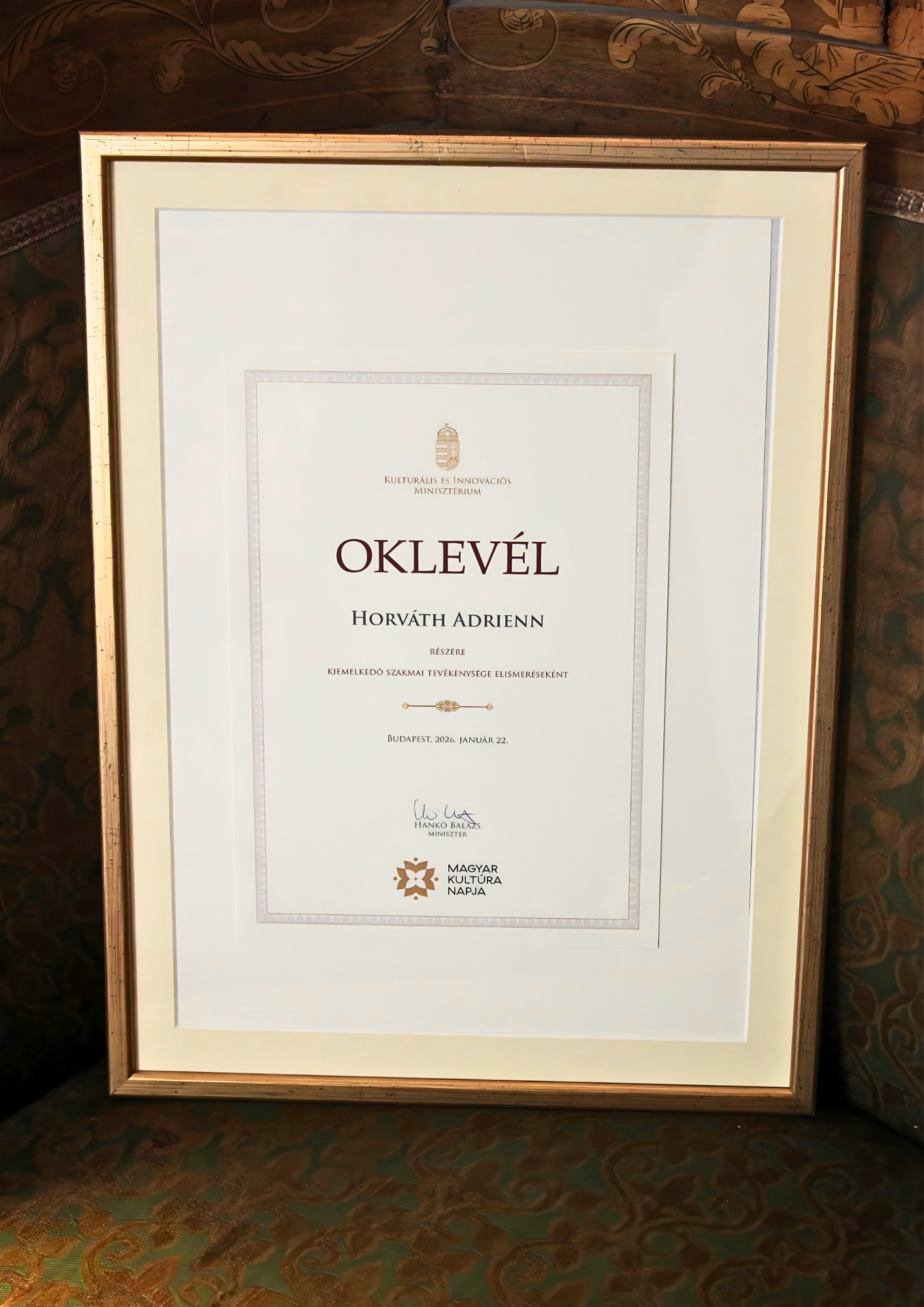 Örömmel osztjuk meg a hírt, hogy 2026. január 22-én délelőtt került sor a Magyar Kultúra Napja Fejér vármegyei gálára és díjátadó ünnepsége. Az eseményen adták át a Kulturális és Innovációs Minisztérium elismerő oklevelét. Intézményünk vezetője, Horváth Adrienn kiemelkedő szakmai tevékenysége elismeréseként részesült oklevélben, melyet Hankó Balázs miniszter megbízásából dr. Tanárki Gábor főispán adott át. Ezúton is gratulálunk az elismeréshez!